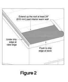 - Ice dam protection is required by most codes in northern climates and should be installed at a min. of 24” beyond the “warm wall” of the house noted in Fig. 2.